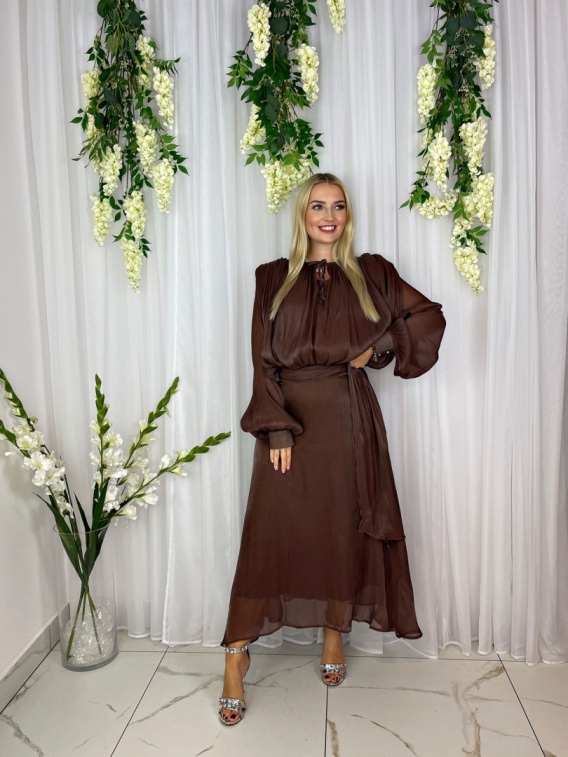 Zwiewna, elegancka sukienka maxi o luźnym kroju, który zapewnia komfort i swobodę ruchów. Góra wykończona stójką z delikatnym wiązaniem dodaje subtelnego uroku, a bufiaste rękawy zakończone mankietami pięknie dopełniają całość. Pasek w talii pozwala na dopasowanie sukienki do sylwetki i podkreślenie proporcji. Dół jest lekko rozkloszowany, co nadaje całości lekkości i romantycznego charakteru. To model, który doskonale sprawdzi się na eleganckie przyjęcia, uroczystości rodzinne czy wyjątkowe kolacje. 🌸