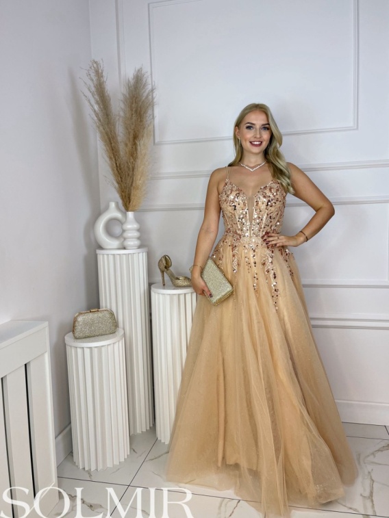 ✨ Sukienka MALEDIWA to spektakularna propozycja maxi, która przyciąga wzrok bogatym zdobieniem i delikatnym blaskiem. Gorsetowa góra z cienkimi ramiączkami zachwyca efektownym wyszywaniem z cekinów i koralików 💎, a transparentne wstawki dodają jej lekkości i subtelnej zmysłowości. Tył z efektownym wiązaniem pozwala idealnie dopasować sukienkę do sylwetki. Rozkloszowany dół z kilku warstw tiulu pięknie układa się w ruchu, tworząc bajkowy efekt ✨. Idealna na bale, studniówki czy przyjęcia, gdzie chcesz błyszczeć ✨.