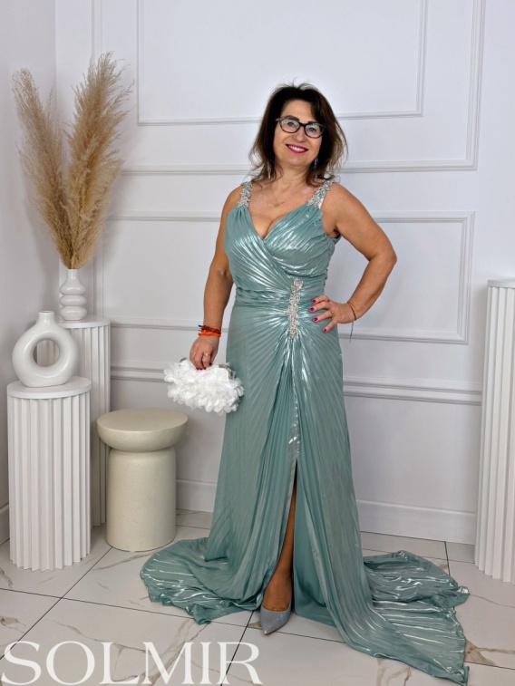 Plisowany, lekko połyskujący materiał nadaje całości wyjątkowego, wieczorowego charakteru, a rozcięcie na nodze dodaje lekkości i zmysłowości. Ozdobna aplikacja w talii stanowi elegancki akcent i przyciąga spojrzenia.
