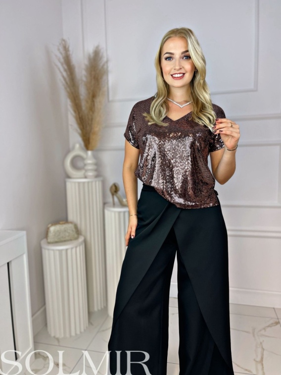Bluzka GOODIE to połączenie zmysłowego blasku i elegancji w nowoczesnym wydaniu. Uszyta z efektownej, błyszczącej tkaniny, pięknie odbija światło i przyciąga spojrzenia, doskonale komponując się z eleganckimi spodniami czy spódnicą. Dekolt w literę V subtelnie podkreśla szyję i obojczyki, a lekko opadające rękawy nadają całości lekkości i kobiecego uroku. Krój jest delikatnie luźny, co zapewnia wygodę i swobodę ruchu, jednocześnie zachowując szykowny charakter stylizacji. To idealna propozycja na wieczorne wyjścia, uroczystości i wszystkie chwile, gdy chcesz poczuć się wyjątkowo.
