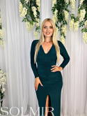 Sukienka AMILLA to elegancka, wieczorowa kreacja o długim kroju, która wspaniale podkreśla kobiecą sylwetkę. Sukienka jest wykonana z gładkiego materiału w głębokim odcieniu butelkowej zieleni, co dodaje jej klasy i wyrafinowania. Posiada głęboki dekolt w kształcie litery V, który wysmukla sylwetkę i dodaje jej subtelnej zmysłowości. Długie rękawy nadają sukience elegancji, a marszczenia w talii podkreślają figurę, optycznie ją wysmuklając. Sukienka jest długa, z efektownym rozcięciem na nodze, które dodaje jej dynamicznego charakteru i zapewnia swobodę ruchów. To idealny wybór na uroczyste wydarzenia, gdy chcesz wyglądać elegancko i stylowo, zachowując przy tym komfort.