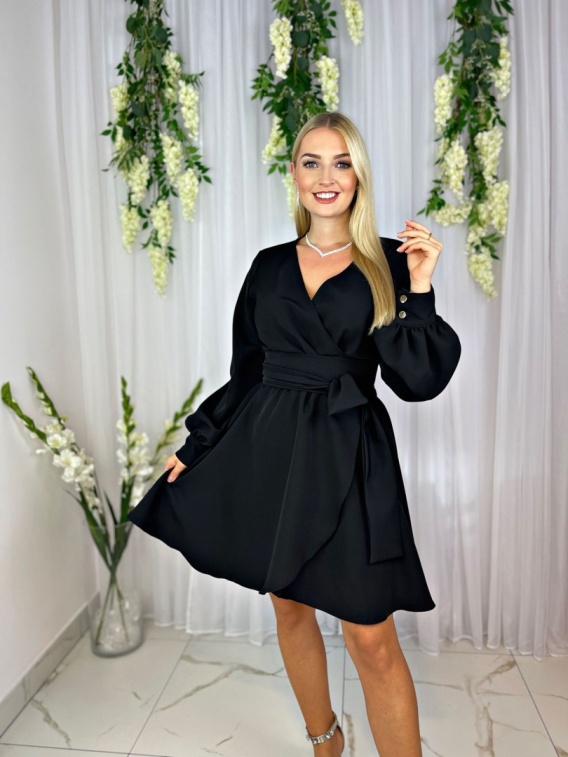 Subtelna i elegancka sukienka mini o niezwykle kobiecym fasonie. Dekolt w kopertowym stylu pięknie eksponuje biust i szyję, a długie, bufiaste rękawy zakończone mankietami z ozdobnymi guzikami dodają klasy i wyjątkowego charakteru. Wiązanie w talii pozwala na idealne dopasowanie, a lekko rozkloszowany dół nadaje całości lekkości i dziewczęcego wdzięku. To doskonała propozycja na przyjęcia, randki czy spotkania w eleganckim stylu. 🌸