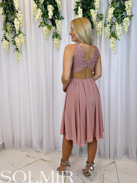 Sukienka SHELLA to krótki, szyfonowy model o wyjątkowej elegancji. Jej góra wykonana z koronki dodaje delikatności i uroku, podczas gdy gołe plecy dodają nuty zmysłowości. Dzięki gumce w pasie sukienka doskonale dopasowuje się do sylwetki, podkreślając ją w subtelnym sposób. Elegancka w swej prostocie, ta sukienka jest idealna na wiele okazji, od letnich przyjęć po romantyczne randki, emanując wyrafinowanym stylem.