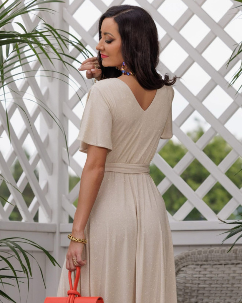 Sukienka w niesamowitej, błyszczącej tkaninie. Połyskująca w całości, przyciągając wszystkie spojrzenia. Zakładany dekolt doskonale eksponuje biust niezależnie od jego rozmiaru. W pasie gumka, pasek w komplecie. Przepiękny rękawek.