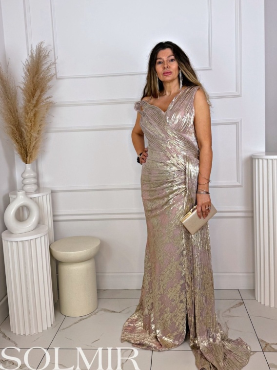Połyskujący, wzorzysty materiał nadaje całości luksusowego charakteru, a wysokie rozcięcie na nodze dodaje kobiecości i lekkości.