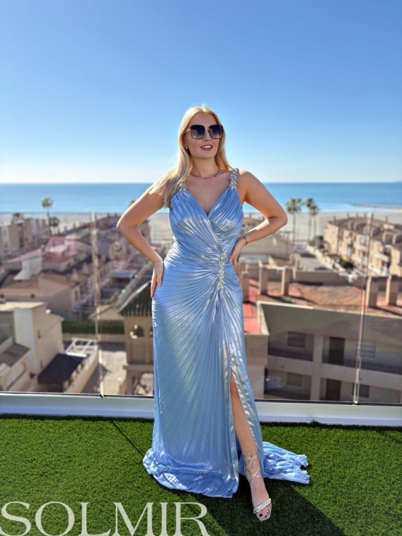 Plisowany, lekko połyskujący materiał nadaje całości wyjątkowego, wieczorowego charakteru, a rozcięcie na nodze dodaje lekkości i zmysłowości. Ozdobna aplikacja w talii stanowi elegancki akcent i przyciąga spojrzenia.