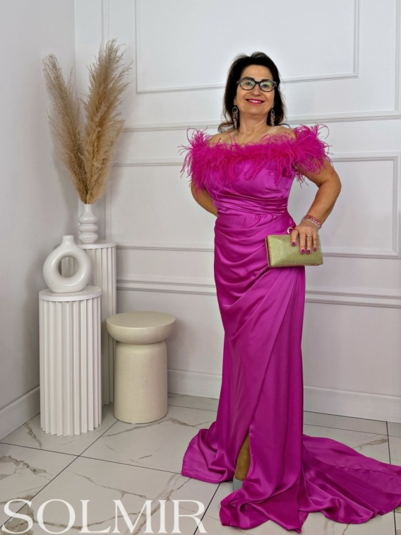 Efektownym akcentem są pióra przy dekolcie – delikatne, lekkie i niezwykle glamour. Sukienka opada na ramiona, subtelnie je eksponując, co czyni ją idealną propozycją na wyjątkowe wieczory, gale i czerwony dywan ✨