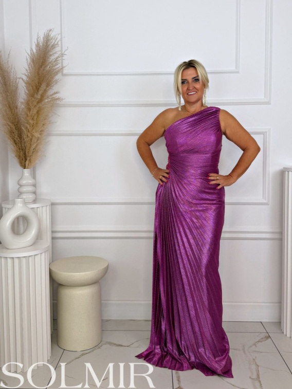 Plisowany, połyskujący materiał przyciąga spojrzenia i nadaje całości wyjątkowego, wieczorowego stylu. Wysokie rozcięcie na nodze dodaje lekkości i kobiecości.