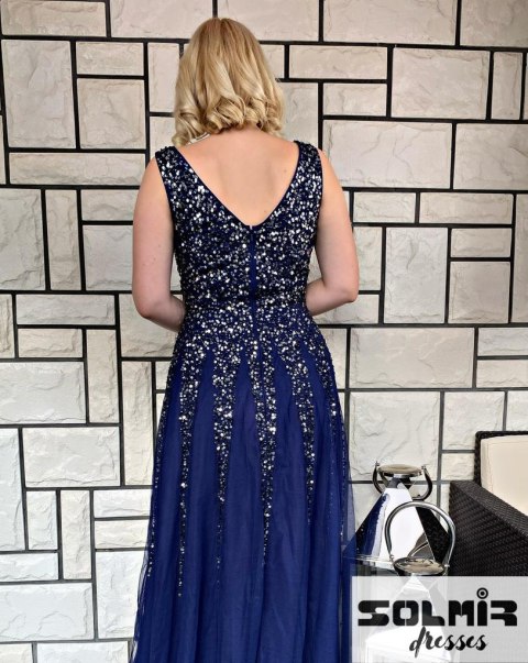 Długa suknia, z ręcznie zdobioną cekinami górą, które efektownie lecz delikatnie przechodzą na tiulową spódnicę. Dekolt w szpic.